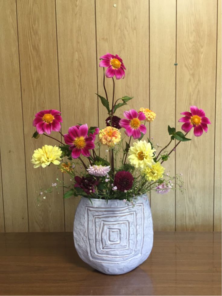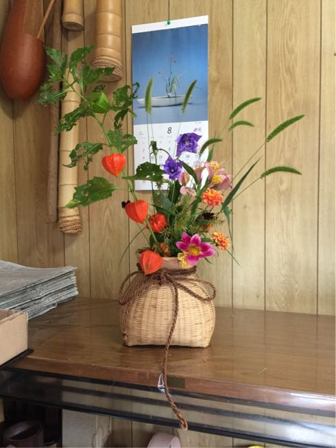 ホオズキ、桔梗、狗尾草(えのころぐさ)、ダリア、チョコレートコスモス、アレストロメリア、マスワリ草の自由花です。