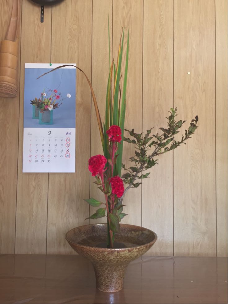 菖蒲、キズ、鶏頭の三種生けです。