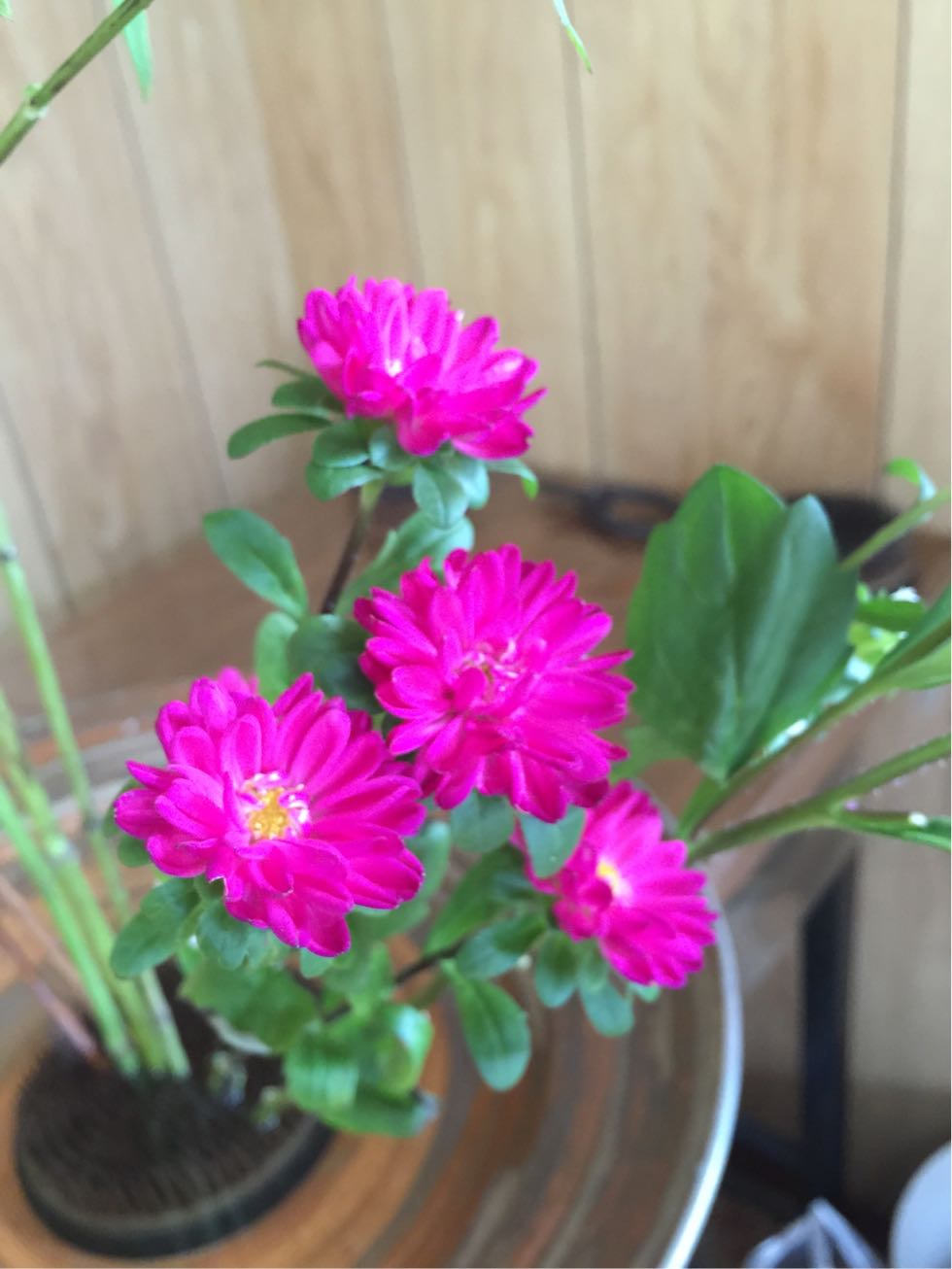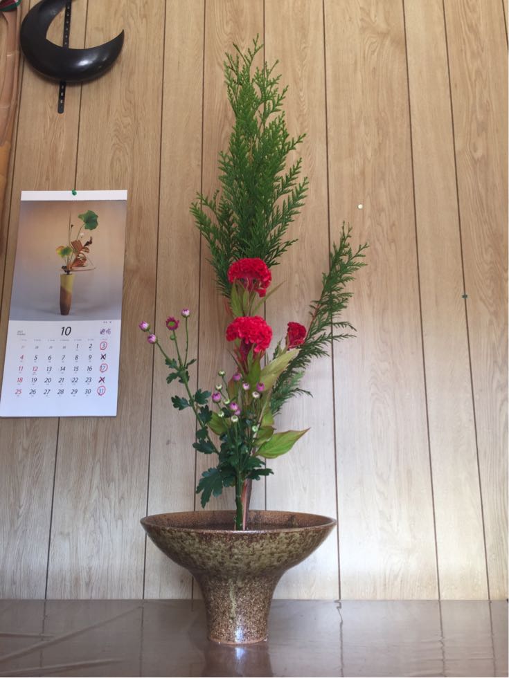 ヒバ、鶏頭、小菊の三種生けです。