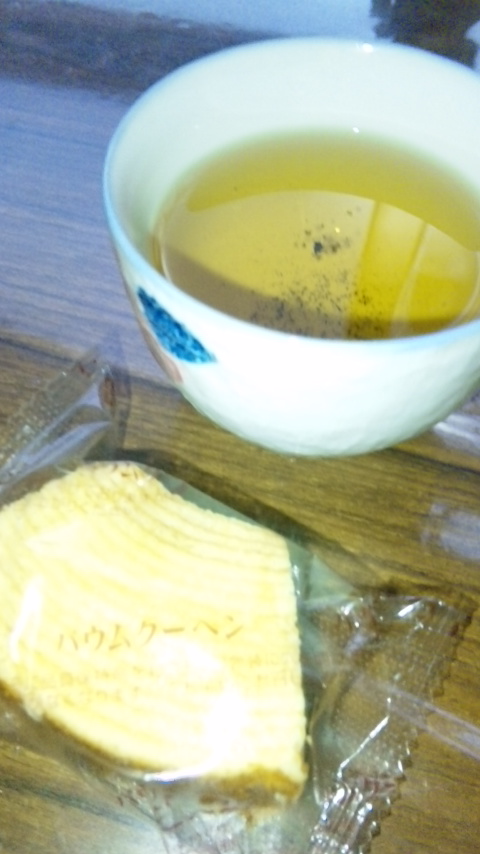 番茶とバウムクーヘンを頂きました。