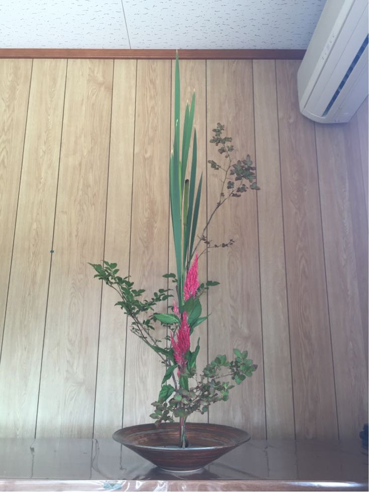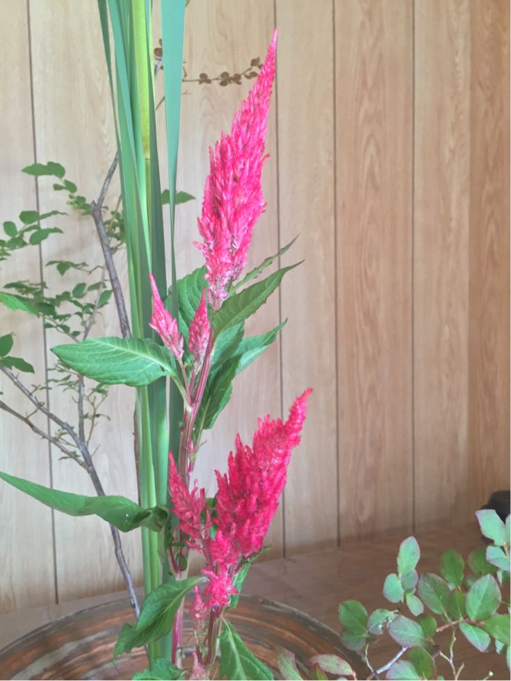 ガマ、ヒメナツハゼ(キズ)、ケイトウの三種生けです。