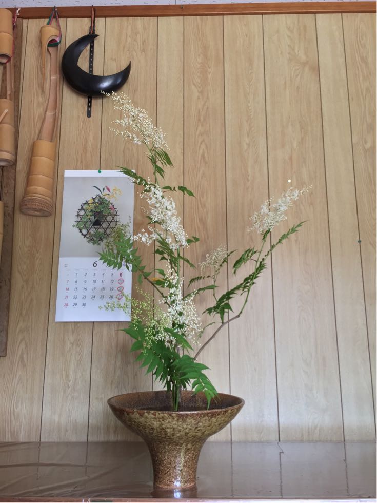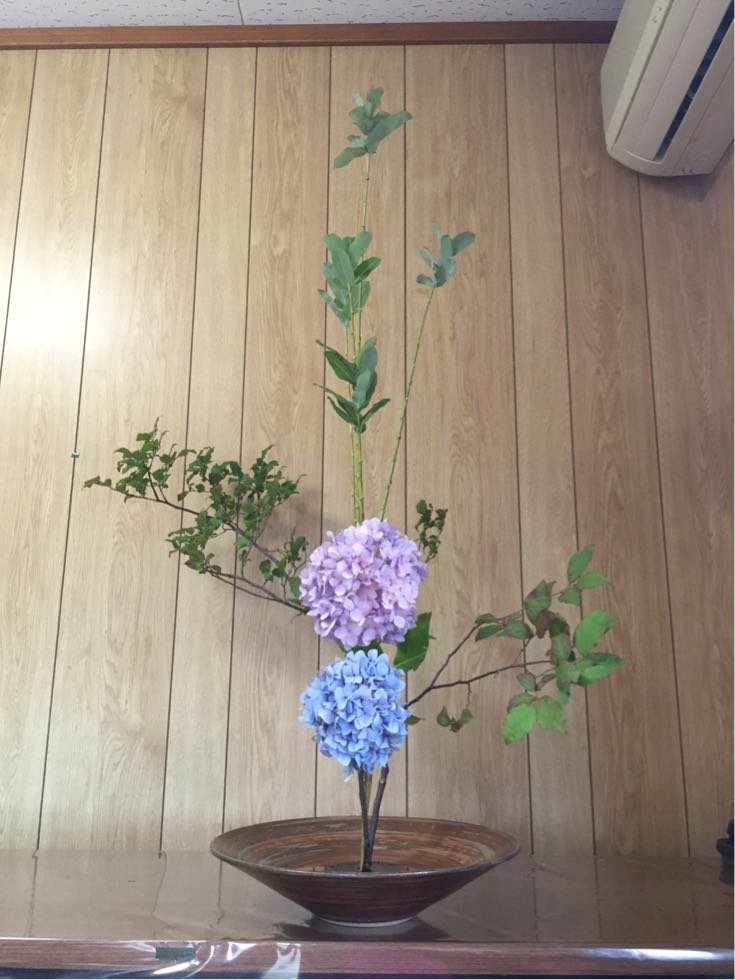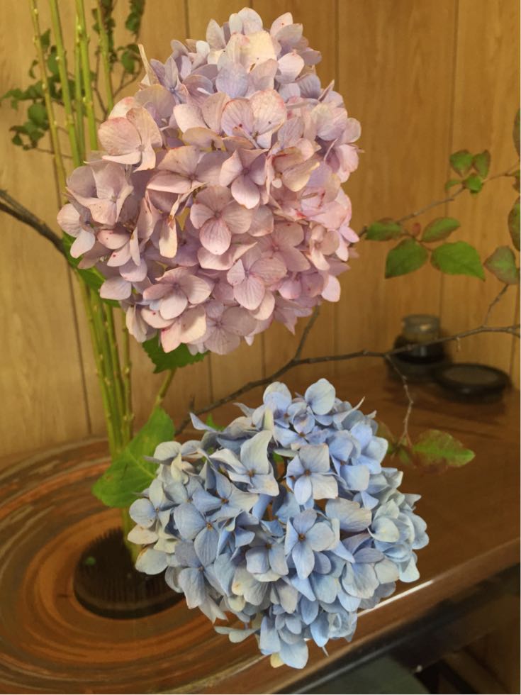 米柳(ベイリュウ)、ナツハゼ、紫陽花の三種生けです。