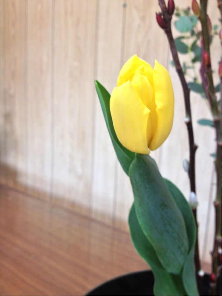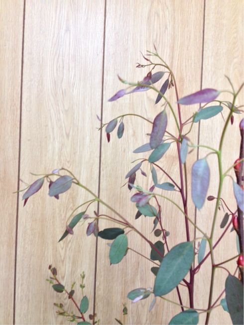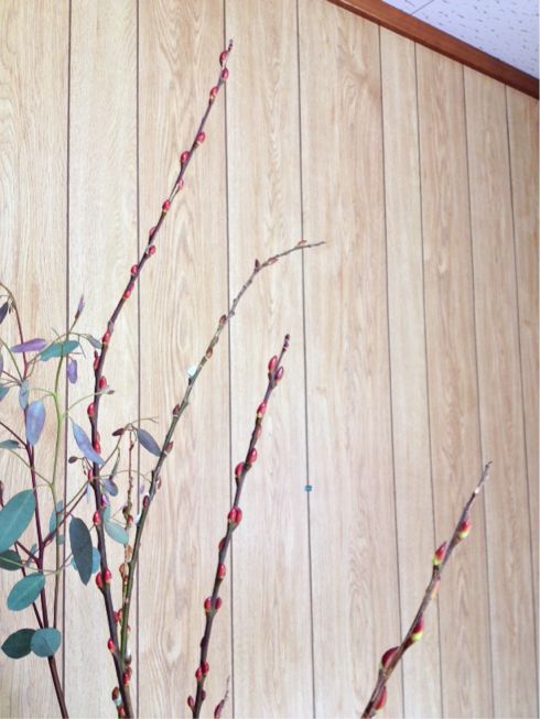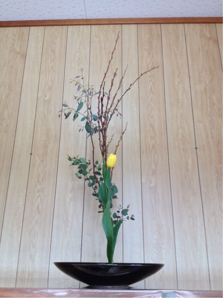 アカメヤナギ、ユーカリ、チューリップの三種生けです。