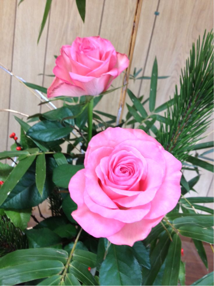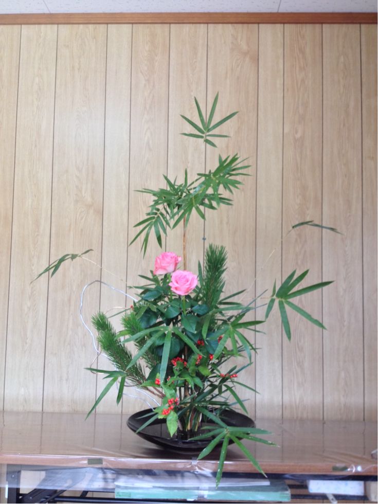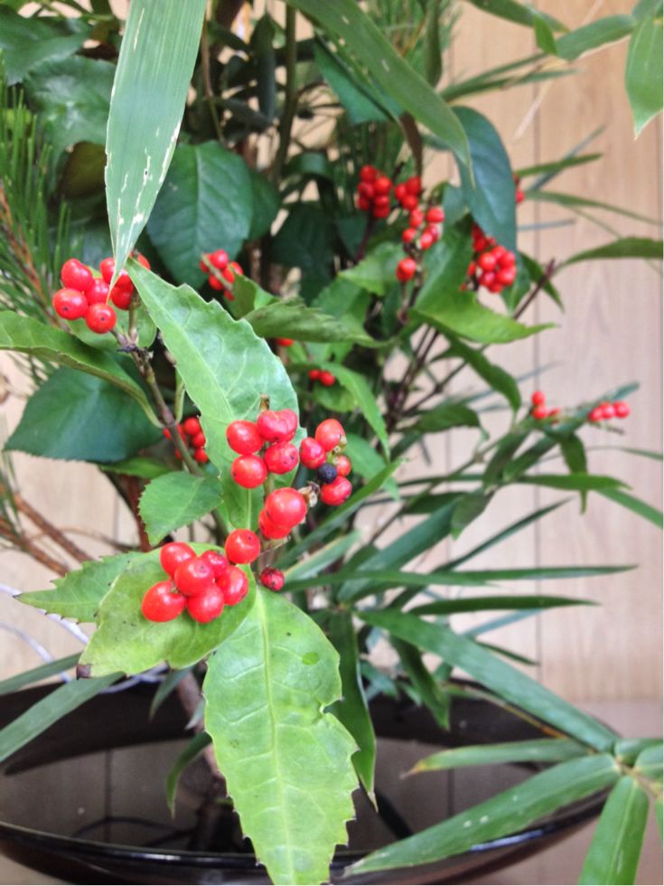 金明竹、千両、若松、薔薇、金銀蔦の盛花です。