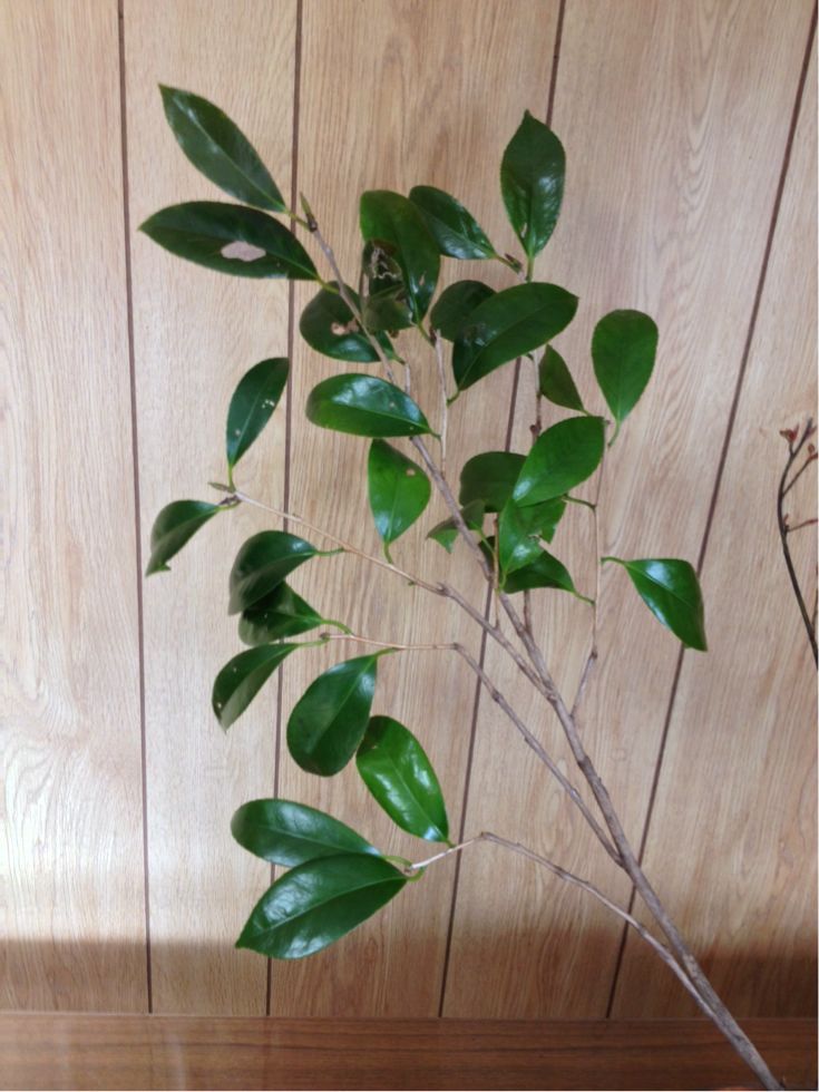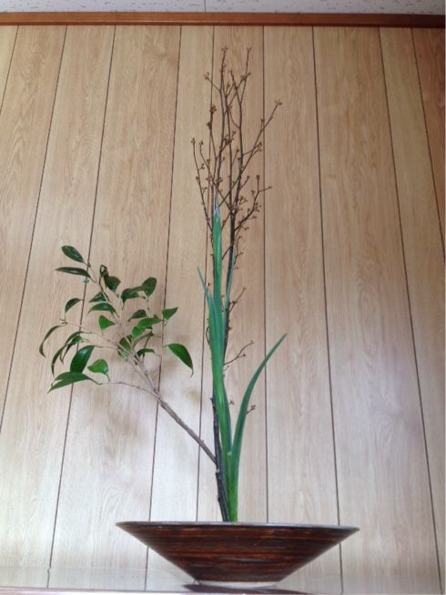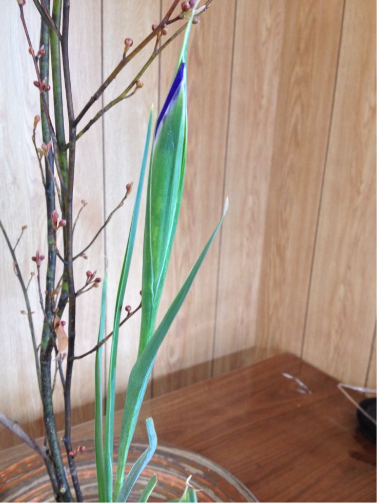 クロモジ、椿、アイリスの三種生けです。