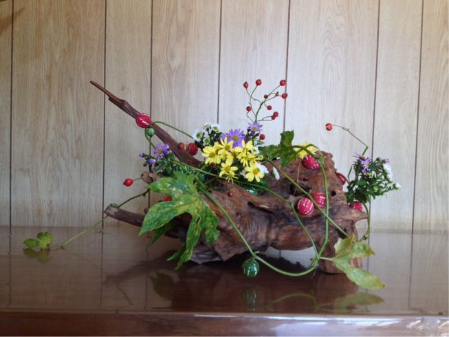 スズメウリ、野茨の実、野紺菊、小菊、レモンマリーゴールドの自由花です。
