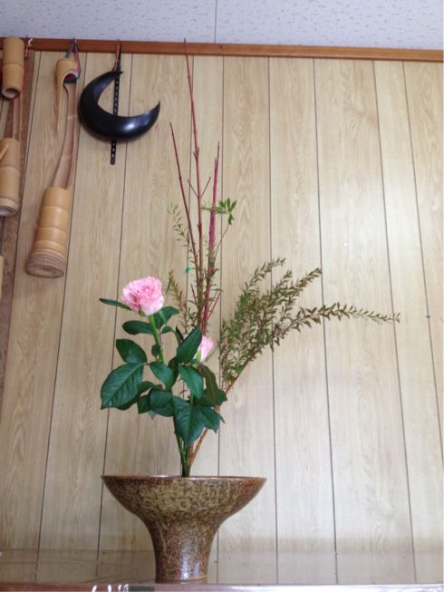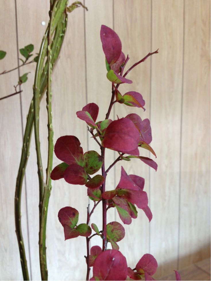 サンゴミズキ、雪柳、薔薇の三種生けです。