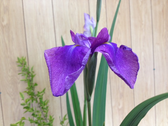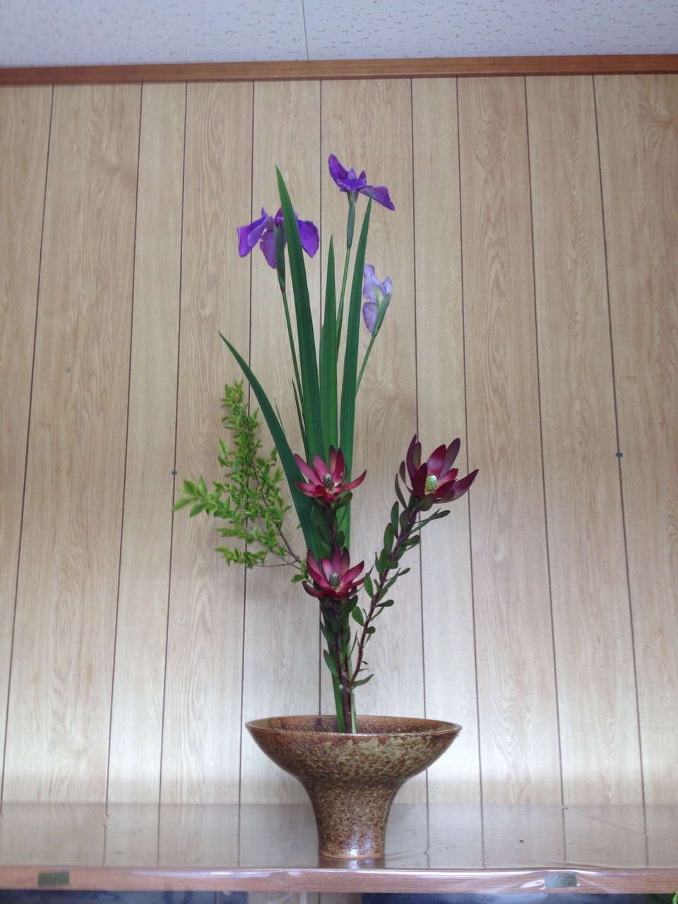 菖蒲、イボタ、レウカデンドロビュウムの三種生けです。