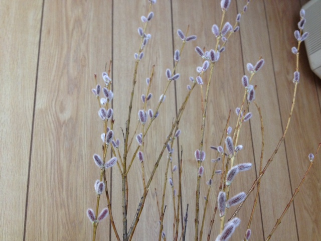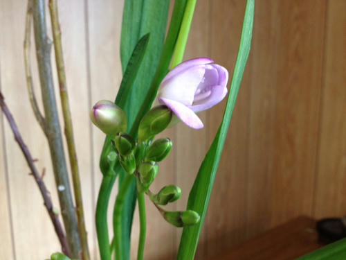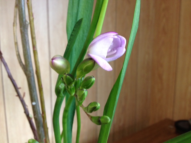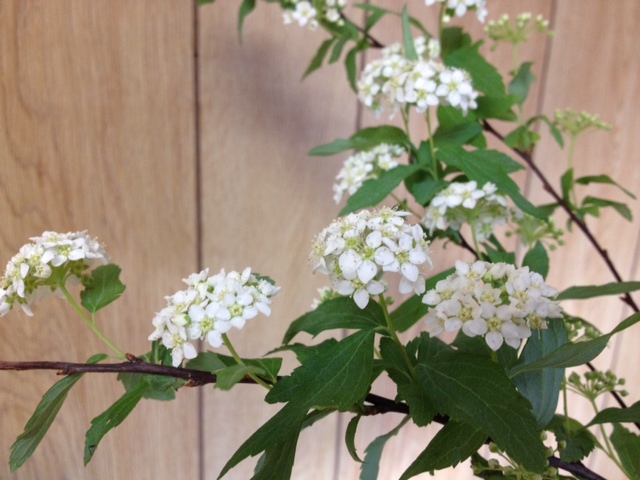 米柳(ベイリュウ)、小手毬、フリージアの三種生けです。
