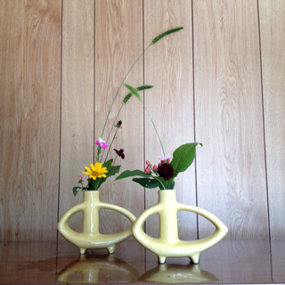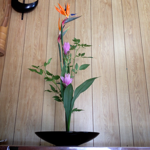 ストレリチア、ソケイ(夏黄梅)、クルクマの三種生けです。