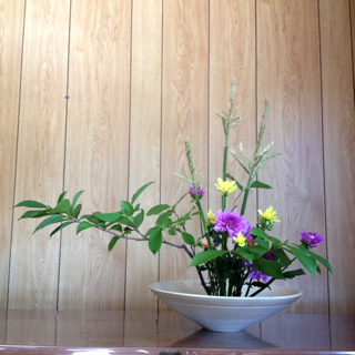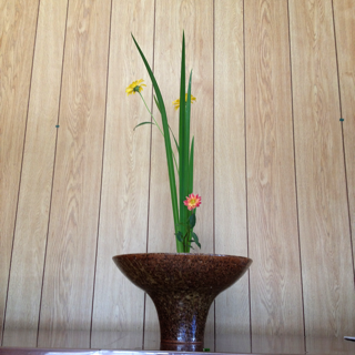 菖蒲、姫向日葵、ダリアの三種生けです。