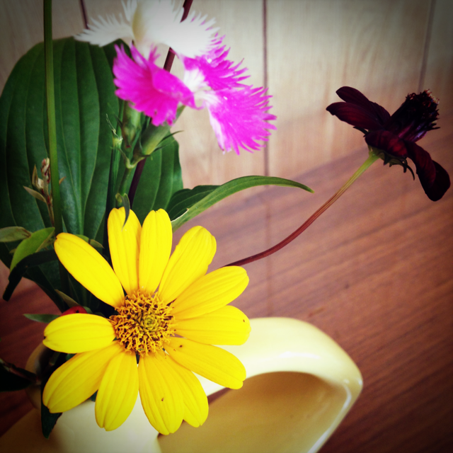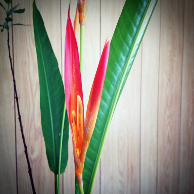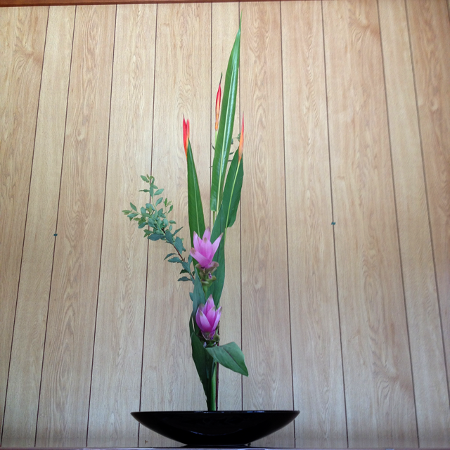 ヘリコニア、小手毬、クルクマの三種生けです。