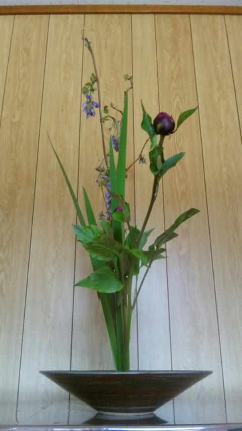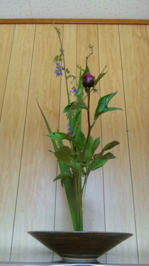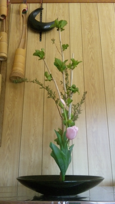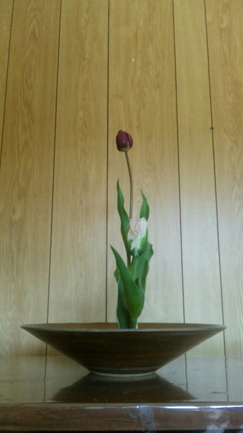 紫陽花、イワテマリ(スズカケ)、チューリップの三種生けです。
