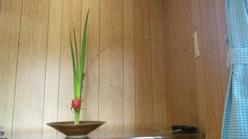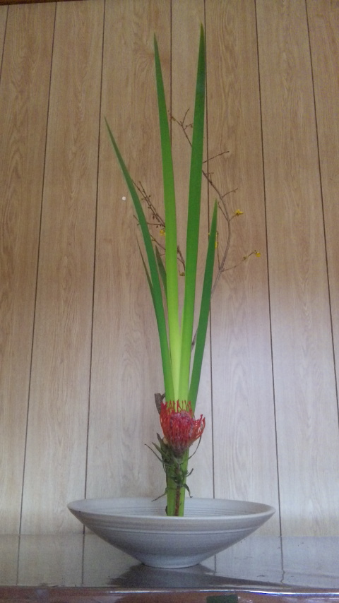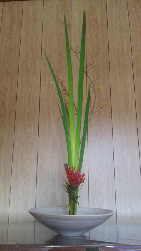 連翹(れんぎょう)、オクロレウカ、ピンクッションの新風体です。