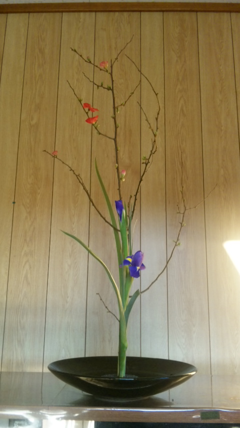 ボケ、アイリス、オクロレウカの三種生けです。