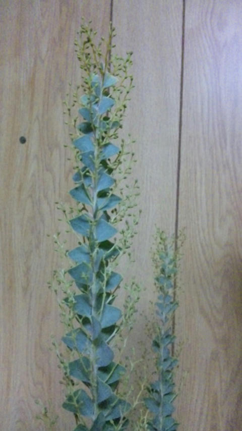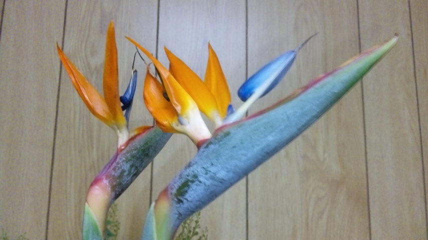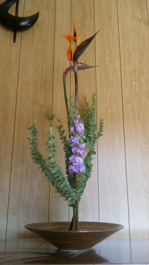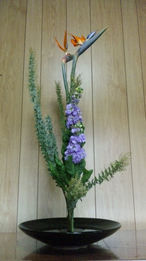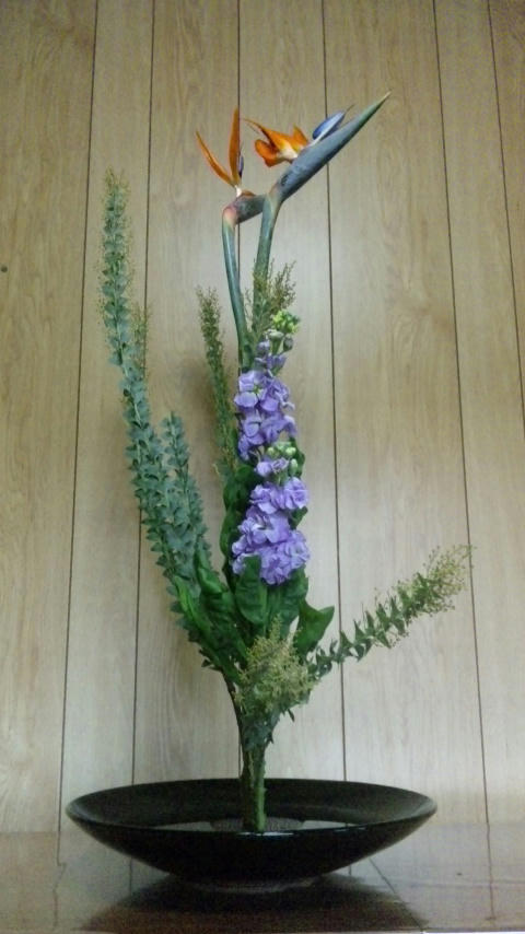 ストレリチヤ、三角アカシア、ストックの三種生けだよ。