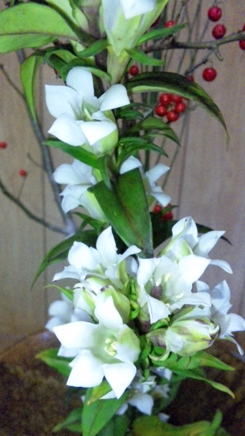 梅擬(うめもどき)、竜胆、エニシダの三種生けです。