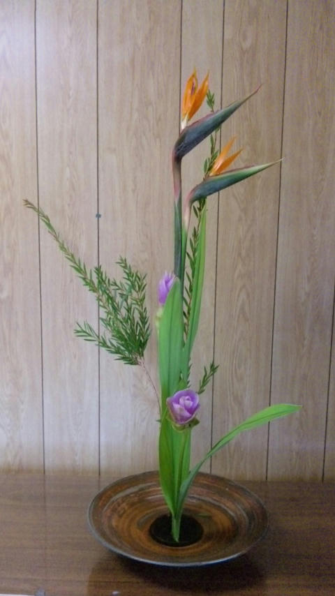 ストレリチア、クルクマ、キンポウジュの三種生けです。