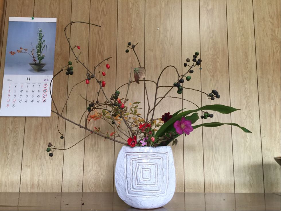 サンシュユの実、南京ハゼ、ドウダンツツジ、撫子、コスモス、テッセン(クレマチス)などの自由花。