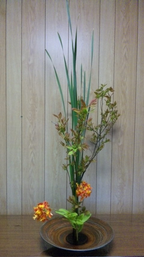ガマ、ナツハゼ、エビデンドロリウムの三種生けです。