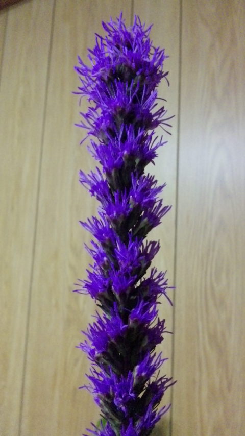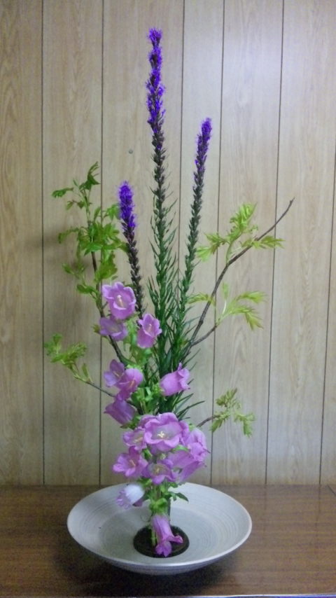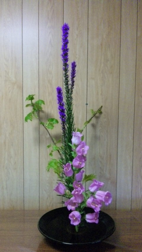 リアトリス、ヤマナンテン、つりがね草の三種生けだよ。