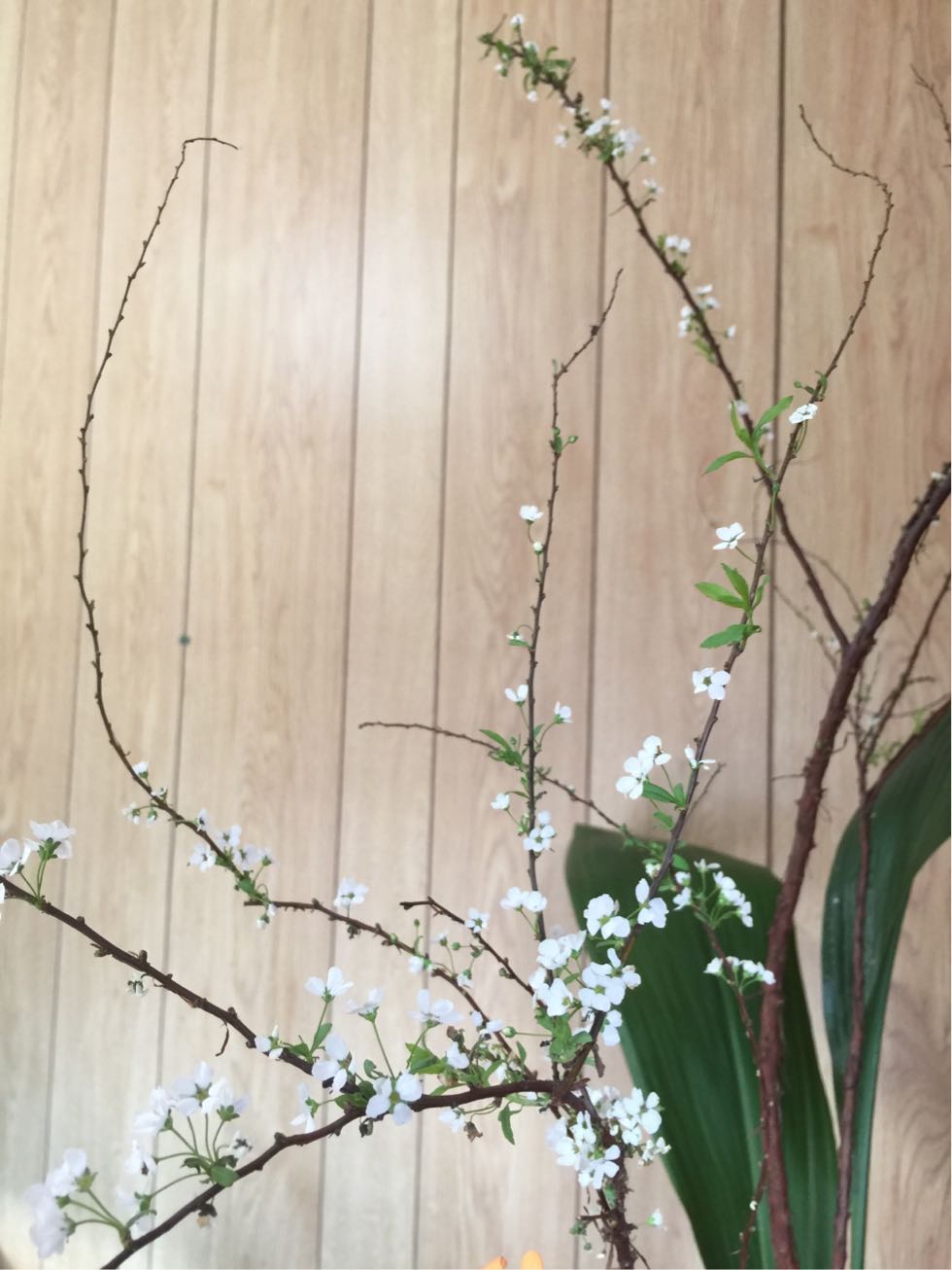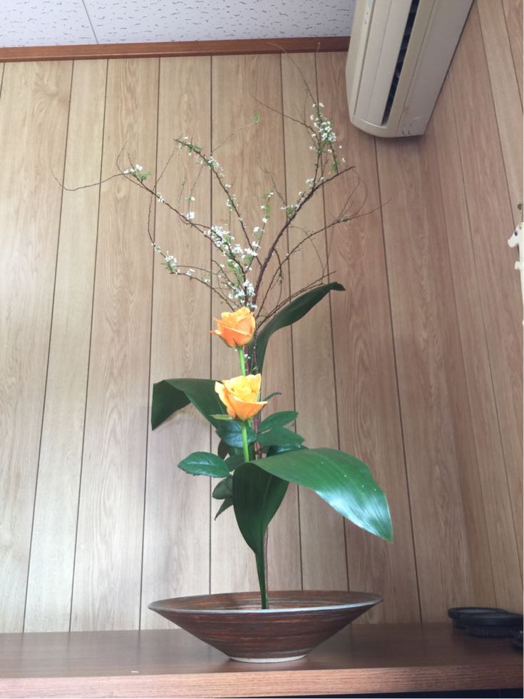 雪柳、ハラン、薔薇の三種生けです。